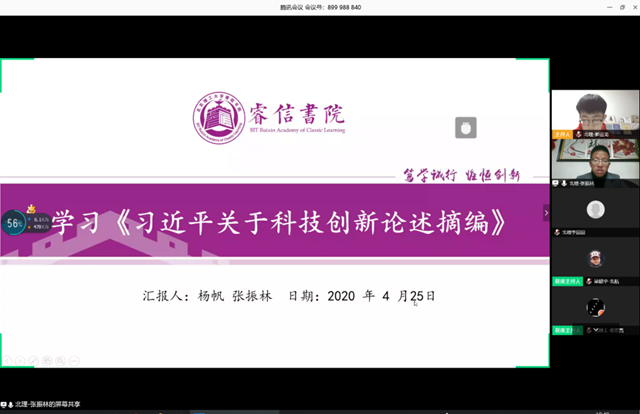 睿信书院学生党员郭云龙、06911801团支部赵居甲带领大家学习了习近平总书记给北京大学援鄂医疗队全体“90 后”党员的回信及“90 后”党员的先进事迹。 学生党员杨帆、张振林领学了《习近平关于科技创新论述摘编》,对与青年科技创新有关的内容进行了重点解读。