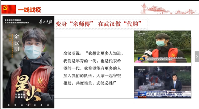 北航优秀志愿者余汉明讲述了自己在武汉做“代购”的亲身经历,带领大家了解了基层疫情防控志愿者的辛勤工作,展现了青年大学生不畏艰辛、无私奉献的优秀品质。
