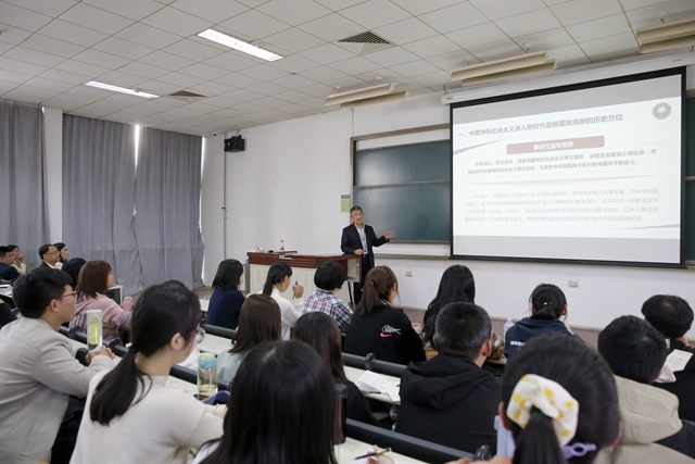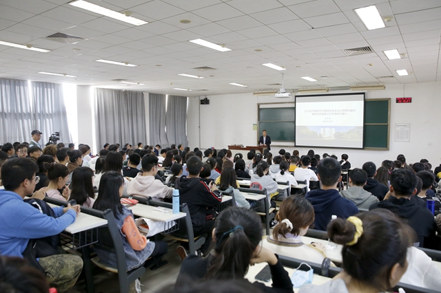 “我印象最深的一句话就是‘马克思主义理论是我们认识世界、改造世界的强大思想武器’。书记鼓励我们学好、用好马克思主义哲学,要求我们好好研究马克思主义的方法论,以习近平新时代中国特色社会主义思想武装我们的头脑、指导我们的实践、推动我们的学习和工作”。在课后的访谈中,来自2020级明德书院的龙宣羽同学不无感慨地说道。在第一部分的授课内容中,赵长禄以“中国特色社会主义进入新时代”作为开场,对新时代战略目标、新时代指导思想进行了深入的解读,并向同学们细致阐释了习近平新时代中国特色社会主义思想的丰富内涵,深化了同学们对马克思主义中国化最新理论成果——习近平新时代中国特色社会主义思想的认识。