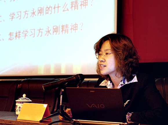 会上,党委宣传部部长贺亚兰介绍了“忠诚党的创新理论的楷模”——方永刚的优秀事迹。方永刚同志深入学习党的理论、坚定信仰党的理论、积极传播党的理论,而且用自己的实际行动模范践行党的理论。从他的身上,大家看到了共产党员的高度政治觉悟,看到了优秀教师的高尚师德师风。