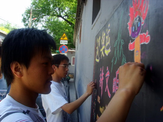 柳荫街社区是北京市的双拥模范社区和文明社区,同时也是西城区的爱国主义教育基地。全体成员抵达社区后,以社区居委会为主阵地,马上按各自分工开始安装音响器材,布置桌椅,张贴奥运宣传海报,悬挂奥运宣传横幅。经过一阵紧张的忙碌,宣传场地终于布置完成。