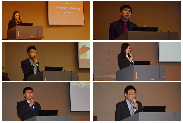 首先上场的是13研硕士四班党支部的王灏同学,她先解释了“中国梦”和“正能量”在当今的社会环境下的含义,之后她用三个感人的故事告诉我们应该如何“传播正能量,践行中国梦”。随后登场的科技创新创业基地党支部的张伟同学则结合支部的特色,通过讲述在新中国的发展过程中为国家、民族的科技进步奉献一生的科学家的故事,阐述如何将个人理想与中国梦相结合。13研硕士五班党支部的郑玮同学的党课主题也是中国梦,但他以时间为线索,描述了在党史中“中国梦”的不断变化,同时结合“中国梦,我的梦”这一主题,对于当代学生党员如何在实现中国梦的过程中做出自己的努力。第四个登场的是10级本科软件工程一班党支部的关放同学,从“造谣者可耻”、“传谣者可恶”和“信谣者可悲”三个角度深入浅出的讨论谣言起因和盲从的危害,分析如何理性、辩证的看待问题,强调当代大学生在杜绝谣言方面应该担当的责任。之后10级本科软件工程二班党支部的郭仔昂同学,他的党课分为三个层次,首先引导党员们在网络社会中,不但要自己不信谣、不传谣,还要积极地利用网络平台引导周围的群众,做表率。与此同时,思考如何在网络社会中继续服务群众,履行党员义务。最后,结合身边刚刚发生的例子,引导大家学会从生活中的细节里践行党员职责,于细微处体现党员的先进性,把服务群众的思想落实到具体的行动中去。最后上场的是10级本科信息安全党支部的赵崇同学,他将国内社会目前所存在的一些问题以及一些消极言论与前任国务院总理温家宝的一句“莫道今年春将尽,来年春色倍还人”做对比,来号召广大青年坚定信念。此外他还对国内腐败问题的深层原因进行着重分析,深刻挖掘造成不良现状的思想根源。