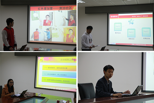 答辩过程中,各支部借助PPT和视频展示了各自的实践成果并回答了评委提问。设计与艺术学院2013级硕士研究生党支部深入密云县西田各庄镇社会福利中心,以“情‘话’敬老院•美‘画’中国梦”为主题,依托专业特长组织开展了一系列书法、手工艺教学等丰富多彩的共建活动,并为其设计了多种宣传资料;信息与电子学院2010级本科生第二党支部在百旺家苑社区体验社区工作,支教明圆小学;人文与社会科学学院2012级研究生党支部为丰台区宛平城地区文化建设“个十百千万”建言献策……活动中各学生党支部创新活动形式,深化活动内容,注重共建交流,讲求工作实效,切实贯彻了“深入群众、服务人民”的宗旨,体现了学习实践科学发展观中“学生党员受教育,人民群众得实惠”的要求,收到了很好的成效,得到了基层党支部、当地人民群众和评委老师的一致好评。