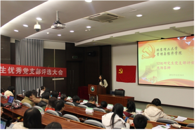 为了进一步完善研究生党支部的制度建设,建设一支先进的学生党支部队伍,丰富党支部活动,培养优秀的学生党员,管理与经济学院举办了2013年12级研究生党支部评优活动。本次评优分为材料审核和现场答辩两个部分,现场答辩于12月15日上午9时在研究生教学楼102教室进行。本次评优活动得到了学院领导和老师的支持和关注,答辩现场共有四位老师莅临指导、担任评委,分别是学院研工委书记梁昊老师、党务工作协理员周卫东老师、MBA教育中心叶晨老师和研究生教学干事刘芳芳老师,大众评审由来自学院2013级研究生的六个党支部的代表组成。