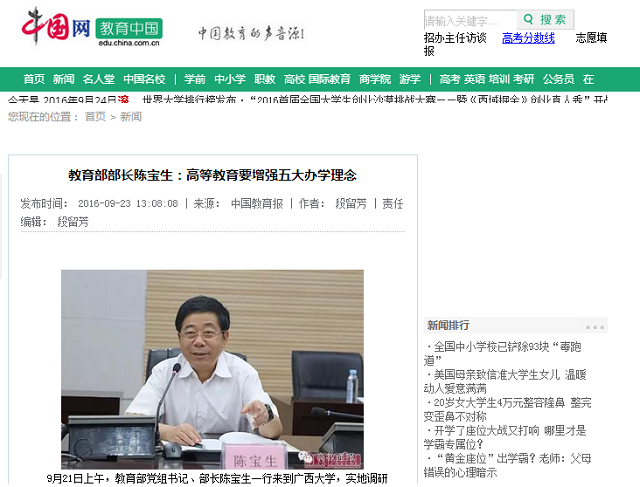 【学习园地】教育部长陈宝生:高等教育要增强五大办学理念