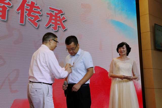 荣休教师代表、管理与经济学院韩伯棠教授为新教师代表、信息与电子学院优秀青年人才胡晗佩戴校徽,并将自己主编的第一版《管理运筹学》精品教材赠送给新教师,希望老一辈严谨的治学态度、宝贵的教学经验和爱生荣校的为师之道薪火相传。