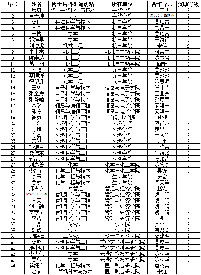 11月3日,中国博士后科学基金会公布《关于公布中国博士后科学基金第68批面上资助获资助人员名单的通知》(中博基字〔2020〕16号),我校宇航学院左磊等52名博士后获得中国博士后科学基金第68批面上资助,获资助总人数较上批次增长73.3%,位列全国第10位;其中,获得一等资助7人,位列全国第2位。