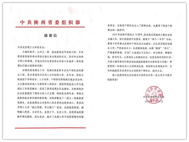 “大地回春早,山河又一新。值此新春佳节来临之际,中共陕西省委组织部对贵校长期以来对陕西的关注、信任和支持表示衷心的感谢,并...