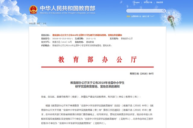 米兰光电创新教育实验基地入选教育部“全国中小学生研学实践教育基地”