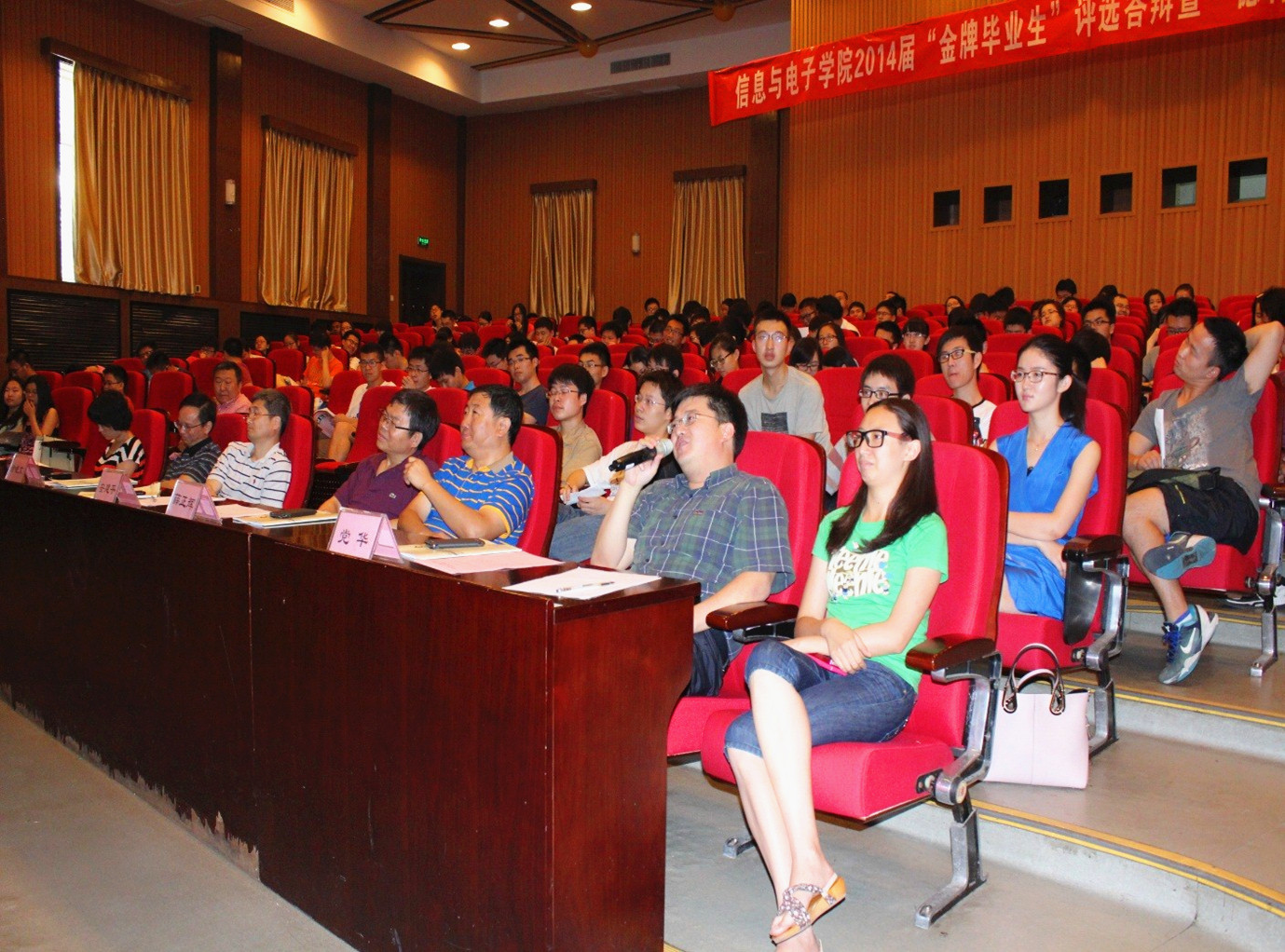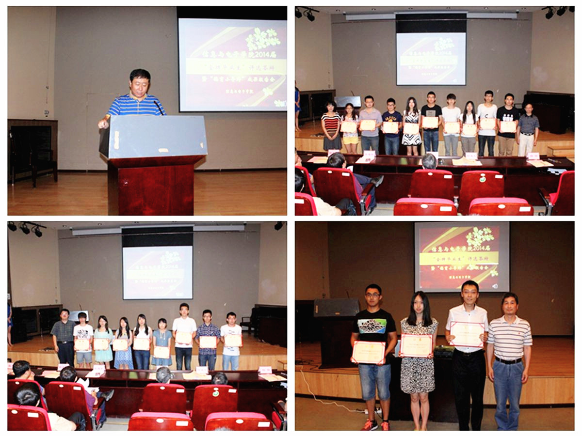 6月26日,信息与电子学院2014届“金牌毕业生”评选答辩暨“德育小导师”成果报告会在7号报告厅隆重举行。信息与电子学院党委书记安建平、副院长徐晓文、副书记副院长党华、副院长薛正辉、副院长何遵文、副院长杨静,2010级毕业生班主任、辅导员及2011级260余名学生代表出席了此次活动。信息与电子学院团委老师韩融担任主持。