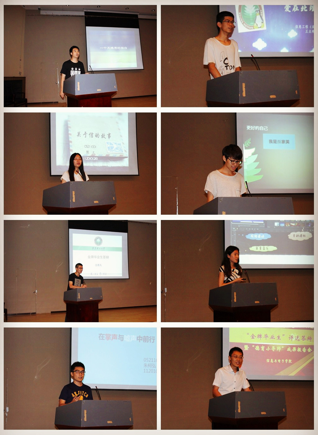 随后,大会举行了2014届“金牌毕业生”评选答辩。王主彬、王若凡、朱柯弘等7名优秀德育小导师进行了答辩。他们每一个人都有着不同的经历,各具风采,有文艺的天蝎男,有狂热的科研达人,也有杰出的学生领袖……王主彬以“爱在北理”为题,讲述了他与科技创新在大学里相遇、相知、相恋的“爱情”故事;陈文以信件为载体,与大家分享了她大学四年来的心路历程;颜家英通过讲述自己在学习、学生工作、兼职等方面的事例,勉励大家“做更好的自己”;朱柯弘结合自身经历,讲述了自己“在掌声与嘘声中前行”的奋斗故事……7名候选人丰富的大学生活和精彩的答辩演讲,深深吸引了在座的每一个人。