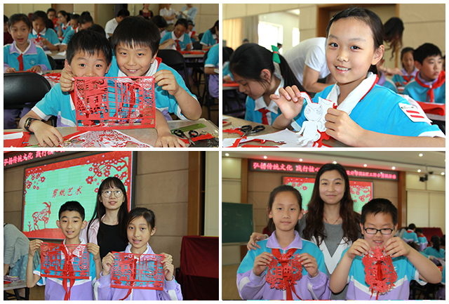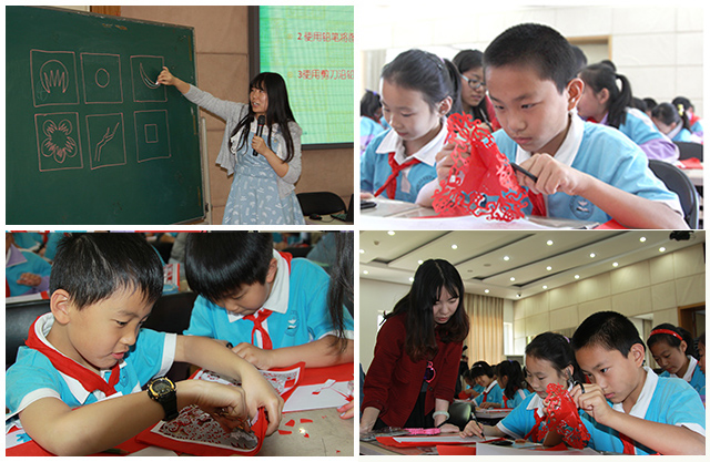 活动开始,设计学院文化遗产专业的谢易晋和工业设计专业的蔡丹同学细心地为小学生介绍了中国传统剪纸的历史以及剪纸的方法。随后,每个志愿者带领几个小学生分组开展剪纸活动。在大学生志愿者的示范和帮助下,小学生们乐在其中,把一个个饱含寓意的图案呈现在大家眼前。经过所有人的共同努力,12套主题鲜明的剪纸作品最终完成。活动最后全体同学共同背诵了社会主义核心价值观“富强、民主、文明、和谐……”,活动在一片欢声笑语中落下帷幕。小学生们纷纷表示感受到了我国传统剪纸文化的独特魅力,也体验到了完成剪纸作品的乐趣和成就感。