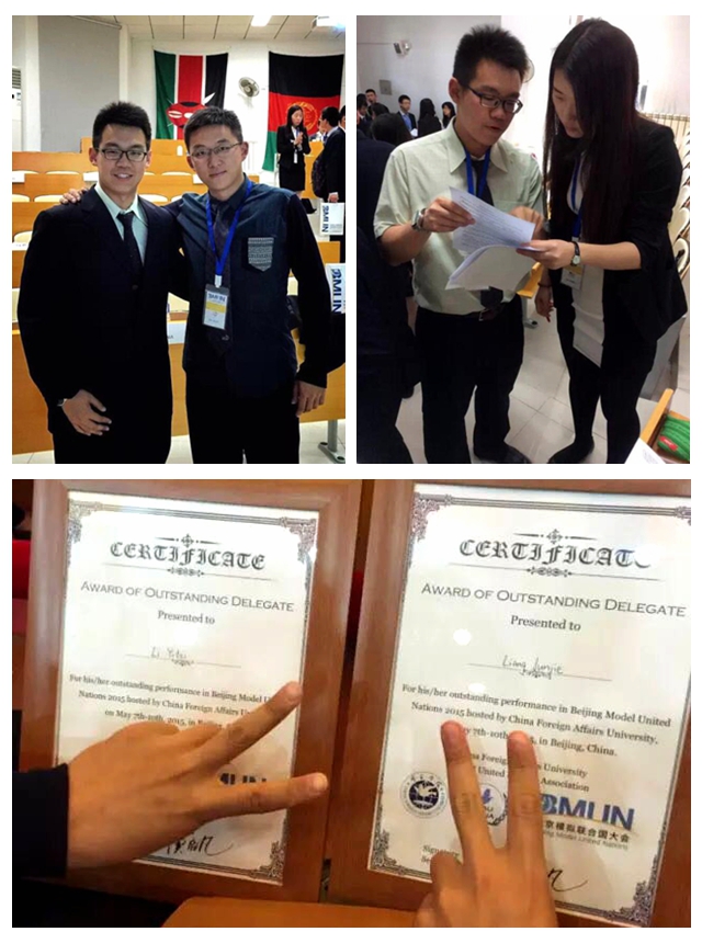 2015年北京模拟联合国大会于5月7日至10日在外交学院举办,我校模拟联合国协会派出的学生梁俊杰和李逸飞获得了杰出代表(Outstanding Delegate)的荣誉称号,创下了我校近年来参加此项活动的最好成绩。