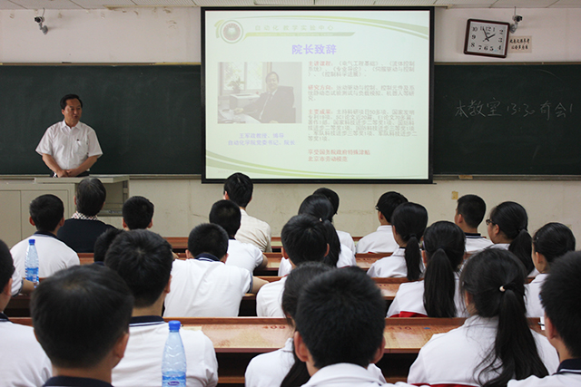 在开课仪式上,首先由自动化学院院长兼党委书记王军政致欢迎辞,王院长先代表自动化学院欢迎二十二中师生来学院参加科技实践开放课;并列举了大量形象生动的事例向学生们介绍了自动化技术在工业生产、武器装备、日常生活中的应用,并嘱托学生们一定要打好基础、积极参与实践,通过学习文化课掌握基础知识,通过参与实践活动开阔视野、激发兴趣、提升创新能力。