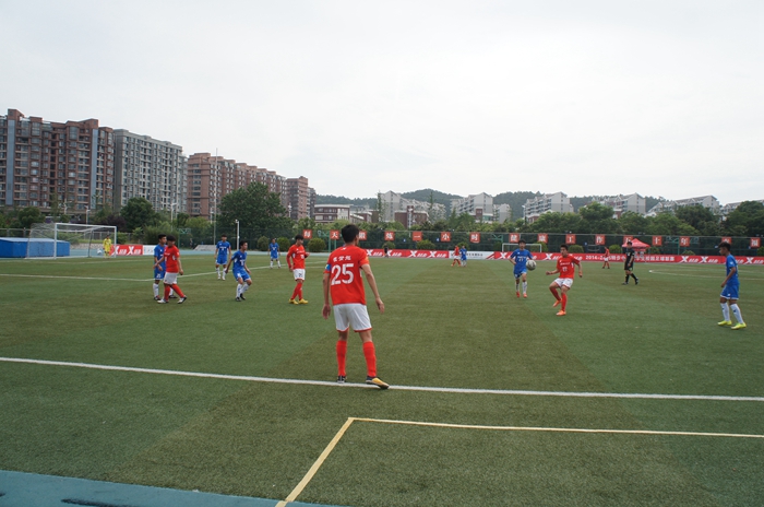 下午两点整,随着主裁判一声哨响,双方队员立即进入比赛状态。哈尔滨师范大学的队员一开始就对米兰的防线展开了猛烈冲击,试图挽回两连败的颓势。第4分钟,哈师大的4号球员突入小禁区,在米兰防守队员的逼抢下没能转身,只得强行传球,皮球直接传到了米兰28号韩伟林脚下。米兰随之发动反击,前场将球转移至左路,无人看防的13号李思晨一脚打门可惜角度太正。第13分钟,裁判吹罚米兰球员在争顶头球的时候犯规,哈师大得到一次在弧顶附近的任意球机会,主罚的球员打门直奔左上角被燕翔山飞身拿住。随后的时间里,哈师大逐渐失去对比赛的控制,只能通过远射来寻找破门机会,但都被燕翔山一一化解。而米兰却频频给对手的防线制造危机,第32分钟,米兰右路起球,李思晨头球后蹭擦远门柱而出。仅仅两分钟之后,金迪川崎分球至右路,27号陈子轩拿球插入禁区突然横敲,29号裴徐俊杰包抄到位,抢在门将之前将球打进,1-0。第38分钟,李思晨接崔博宇传球,晃开角度,一脚搓射飞出右上角。随后米兰也获得了在弧顶附近的任意球机会。25号崔梦旭主罚,皮球贴着地面划出一道完美的弧线,绕过人墙钻入死角,哈师大门将反应不及,比分变为2-0。