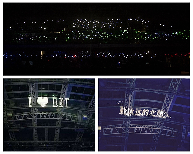 晚会进入后半段,现场大屏幕播放了75周年校庆晚会宣传片《Coming Home》,这时主持人提示毕业生拿起事先藏在座位底下的手指灯,随着现场观众慢慢点亮手指灯,整个看台被渲染成米兰校徽的红、白、绿三色,这时体育馆顶棚也被投射出“I Love BIT”、“致永远的北理人”等字样,现场爆发出雷鸣般的掌声与欢呼声。