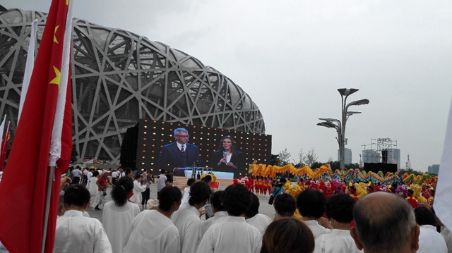 一番准备之后,大屏幕上开始播放申奥的宣传片,场下演员逐渐开始激动起来,齐刷刷的争相昂首观望着大屏幕,生怕不能亲自见证这一伟大的历史时刻;而作为旗手的志愿者们,按捺住激动的心情,坚守着自己的阵地。当奥委会主席接过写有冬奥会主办城市的信封,从中取出写有主办城市的卡片之时,那一刻,志愿者们握紧旗帜,演员们各就各位,广场异常平静。随之,主席巴赫宣读出了Beijing……之后,现场宣读习近平主席的贺词,中共中央政治局常委、中央书记处书记刘云山的讲话也掀起了一波又一波的高潮,现场的所有中国儿女都沉浸在了欢乐的海洋。志愿者代表闫嘉磊说道:“我,能够作为一名志愿者,能为申奥,为社会,为国家,贡献出自己的绵薄之力,能亲身去现场体会那份激动,真的感到无比荣幸。我期待着下一次,无论何时何地,我都愿做一名志愿者,挥动手中的旗帜,为祖国呐喊,为祖国欢呼!”