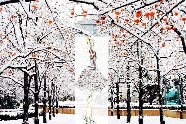 积雪的纯白,柿子的红橙,如同树干上挂着鲜艳的灯笼。南方的孩子一定很少见到雪,而北京近年也很少见到雪。这样中国风式的裙子,在国外的地毯上一定备受瞩目。