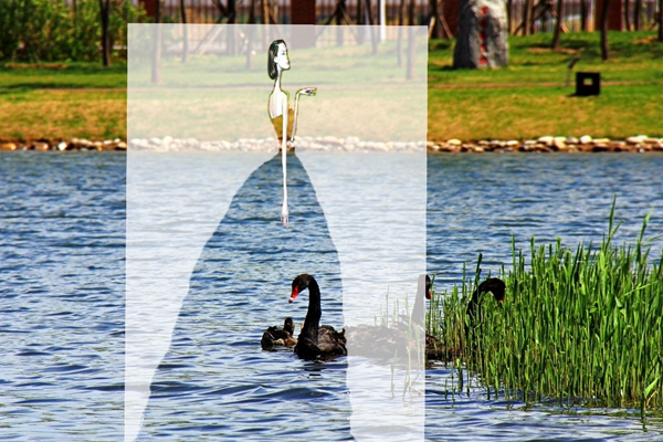 水岸与水中,实物与倒影。虚虚实实,真真假假,倒也是别样的设计。