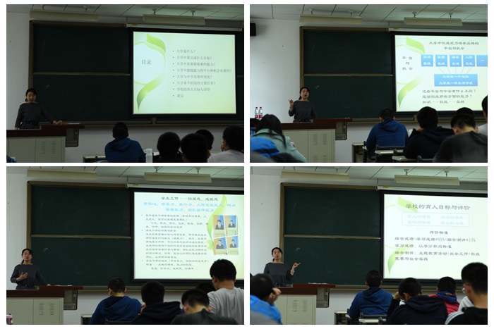 讲座开始前,衡靖书记先以“生命线”的小游戏引出她讲座的主题——“成长与发展”,这个小游戏让同学们感性地体验到生命的有限,大学的四年更是在一生中非常的短暂,而大学又是每个人人格成长与发展的一个关键时期和重要的环境,因此在进入大学后确立目标非常重要。讲座开始后,衡靖书记通过分享优秀毕业生的故事让同学们懂得了大学四年是从青涩到成熟的蜕变过程,是一个人能力、人格快速提升变化的过程。她指出大学生的目标应该是“品格的成长与能力的共同发展”,每个人都应该锻炼自己学习研究、独立思考的能力,培养自己懂得担当、懂得体谅、懂得感恩的高尚品格。随后,她又通过形象而深刻的比喻,让同学们认识到集体与个人的重要关系:优秀的集体离不开优秀的成员,而只有在优秀的集体中才能让自己变得更加优秀。