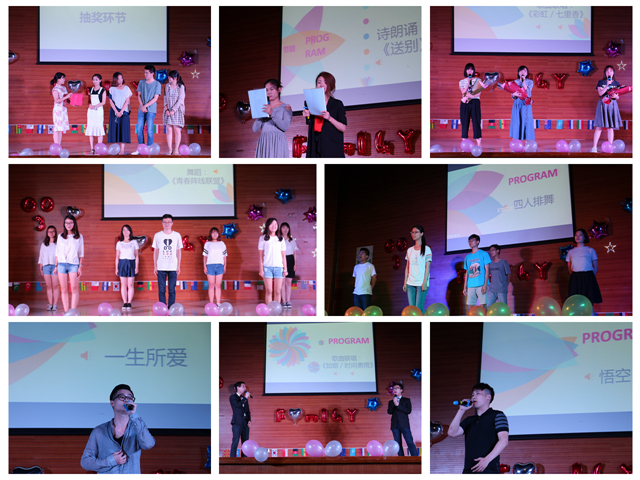 欢乐的第一轮抽奖环节结束后,大四毕业生更是不甘寂寞,纷纷亮出自己的拿手好戏。英语二班集体上演《青春阵线联盟》,从摇摆萌舞到广播体操,引发阵阵欢笑;日语班带来经典《幻想万华镜红雾异变之章》无违和配音,尽显高手风范;英语二班唱起周杰伦经典老歌,《彩虹》《七里香》唤起少时温情回忆;德语班配乐诗朗诵《送别》,中德交织,诉尽人生哲理。