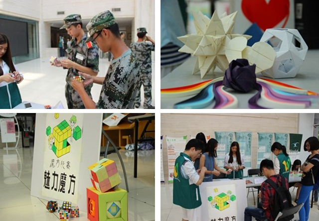 为配合本次赠书活动,图书馆组织微尘志愿者协会和折纸社开展了“魔方还原大赛”,评选出还原魔方用时最短的三位同学,并邀请他们参加赠书仪式。