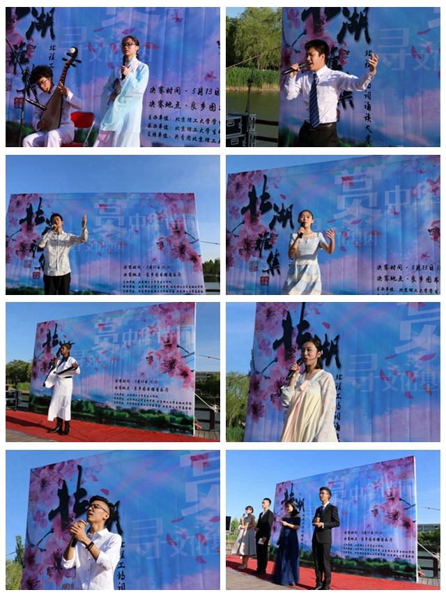 为落实教育部《完善中华优秀传统文化教育指导纲要》工作要求,宣传普及优秀传统文化,营造文明高雅、健康向上的校园文化氛围,2017年5月13日,“北湖雅集”诗词诵读大赛在良乡校区北湖湖畔举办,学生工作处处长郭彦懿、校团委书记肖雄、图书馆党总支书记郑焱以及良乡管理处、各学院领导等出席活动。