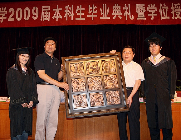 设计与艺术学院的毕业生代表向母校赠送纪念品——“敲铜”。这是由9名设计与艺术学院的毕业生手工敲制而成,把美好的大学生活浓缩到9块铜板画上,表达了对母校的感激与眷恋。郭大成书记、胡海岩校长代表学校接受纪念品,并与毕业生代表合影留念。