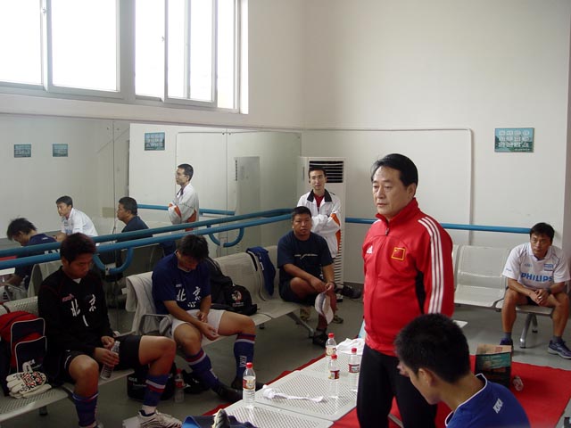 中场休息期间金志扬总教练在排兵布阵,期望下半场扩大战果。