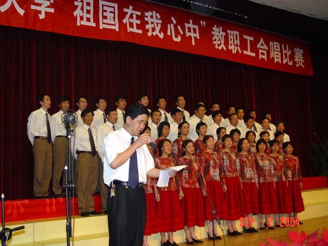 为庆祝教师节20周年和建国55周年,校工会和艺术教育中心联合举办了“祖国在我心中”教职工合唱比赛。共有各学院及机关、直属、后勤等14支代表队600余名教师参赛。经过紧张的准备和排练,9月2日下午,合唱比赛在中心教学楼一层报告厅举行。党委书记焦文俊,校长匡镜明,常务副校长李志祥,副校长侯光明、赵长禄、杨树兴,党委副书记、纪委书记张维维,工会主席赵显利出席并作为参赛队员参加了比赛。