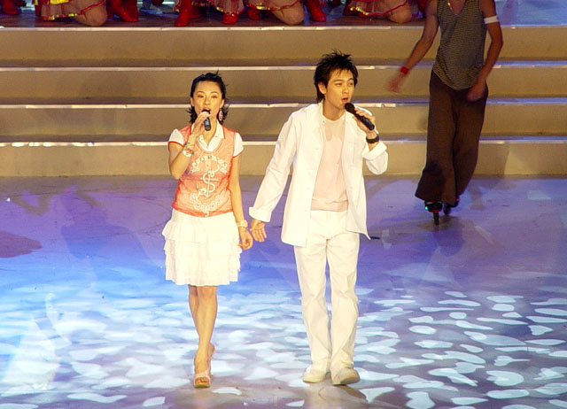 由台湾歌手高明骏和大陆歌手白雪、甘萍联袂表演的《通向2008》让观众遐想万千