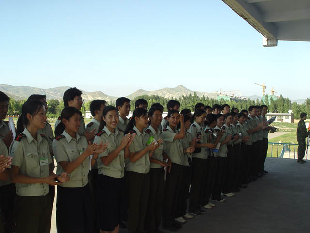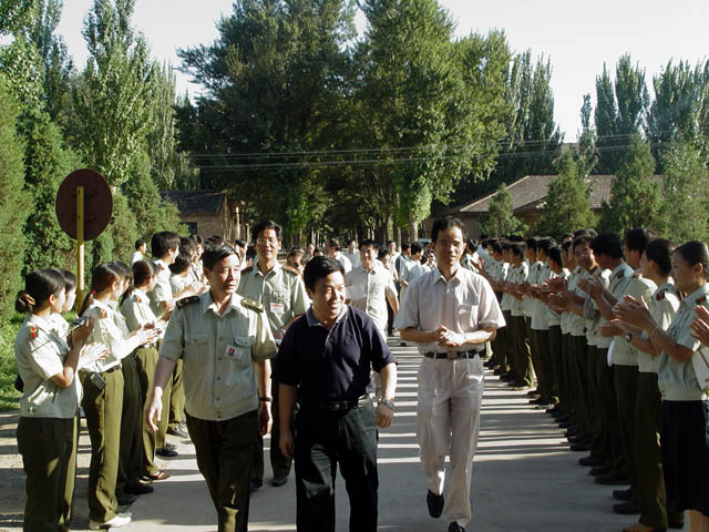 副书记、副校长杨宾、副校长孙逢春和炮兵指挥学院副院长郎守林少将在检阅训练中的学员