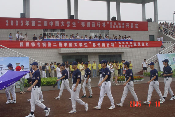 上午8:30,伴着《运动员进行曲》高亢的旋律,12名组成“品”字型旗阵的护旗手护着国旗、会旗、校旗,迈着矫健的步伐走进会场。在青春靓丽,漂亮多姿的花束队姑娘的引导下,裁判员和来自北京大学、复旦大学、浙江大学、米兰milan官方网站、澳门大学、香港棒球总会等27支参赛队的运动员入场。在热烈的气氛中,中国大学生体育协会棒垒球分会主席、北方工业大学党委副书记项进致开幕辞。他说,本次大赛是规模最大的棒垒球体育盛会,将极大推动我国大学生棒垒球体育事业的发展。他在讲话中希望全体运动员、教练员、裁判员和工作人员本着“拼搏、团结、崛起、文明”的宗旨,遵循“更快、更高、更强”的奥林匹克精神,按照“公开、公正、公平”的竞赛原则,努力赛出风格,赛出水平,把本次大赛办成一个大团结、大欢聚的盛会,为推动大学生体育事业做出新的贡献。中国棒球协会秘书长申伟、国家教育部学生体协联合会秘书处竞赛部部长高颖、 郑州市副市长龚立群致贺辞,郑州师专党委书记于向英致欢迎辞,运动员、裁判员代表宣誓后,中共郑州市委副书记、郑州市市长王文超宣布本次大赛正式开幕。