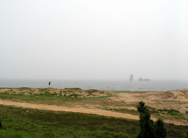 碣石距山海关15公里,位于绥中县城西56公里处的止锚湾海滨,在距岸边200余米的海面之中,耸立着三块巨大礁石,高出海面约20余米。 这里也是民间传说为孟姜女投海葬身之处。每逢落大潮,从岸边到礁石隐约现出一条巨石铺就的海中栈道,可直达礁石脚下。在姜女坟的东西两侧海岸,各有一峭壁伸向海面,东侧叫红石砬子,西侧叫黑石砬子(又称黑山头),象两条巨龙静卧在海中,构成似"二龙戏珠"(海中礁石)的独特景观。红石砬子、黑石砬子和碣石正对的石碑地都发现了秦汉皇帝巨大的行宫遗址。