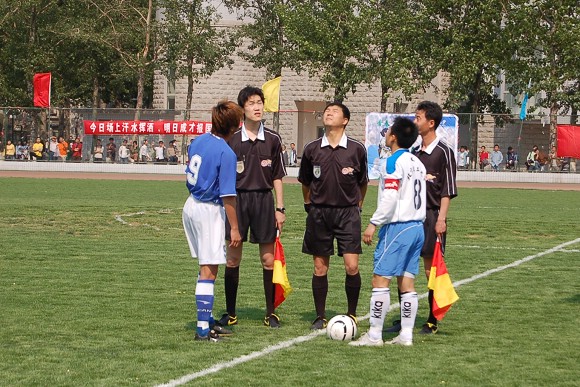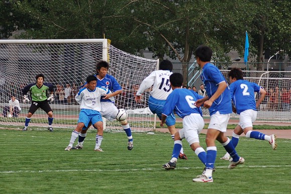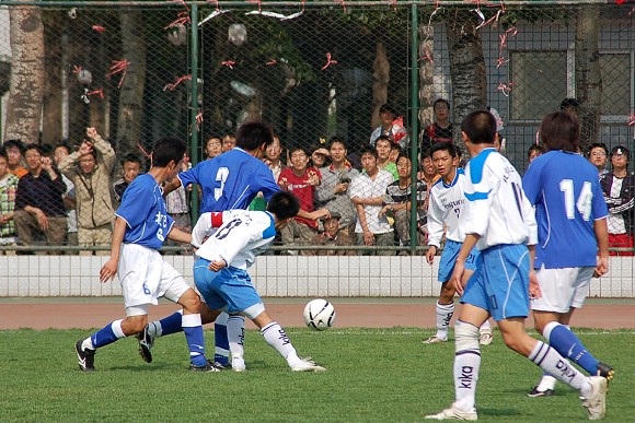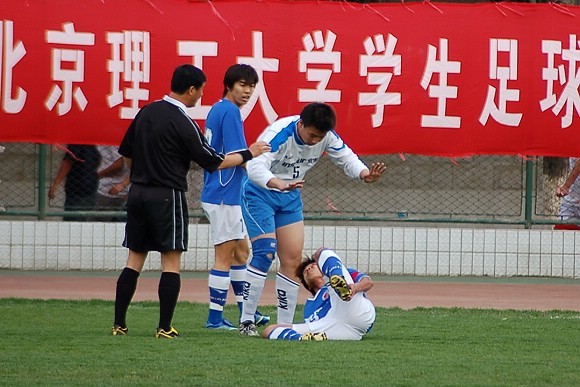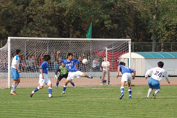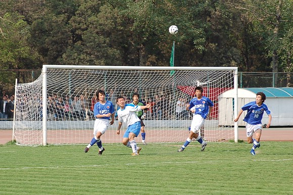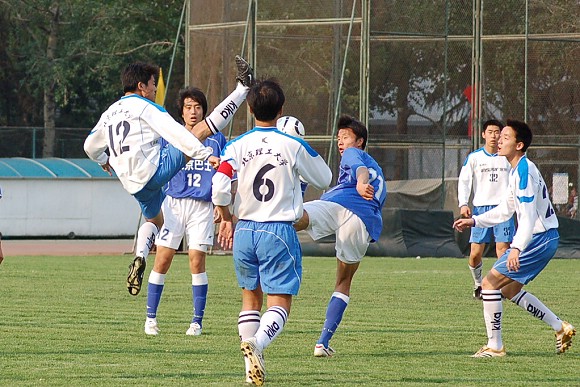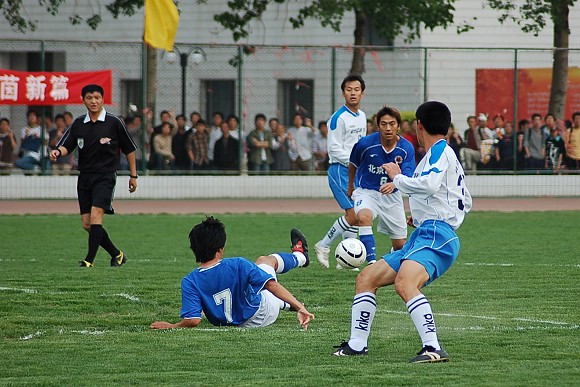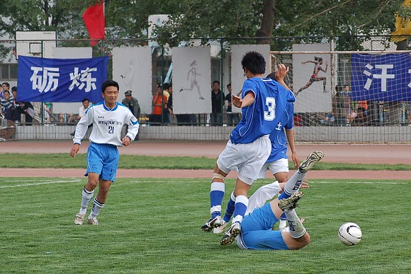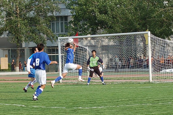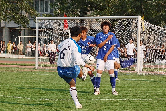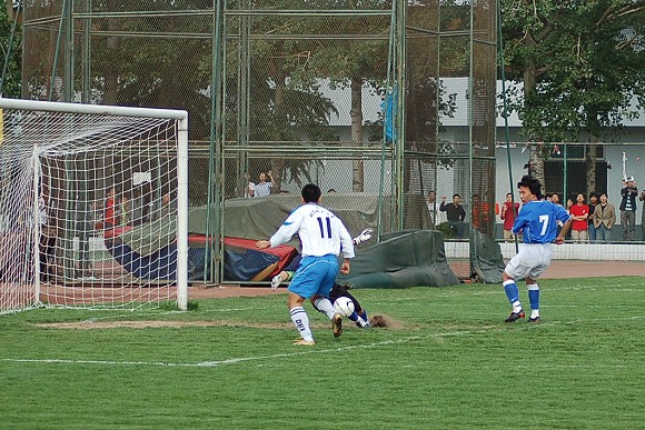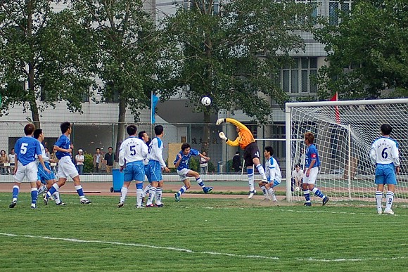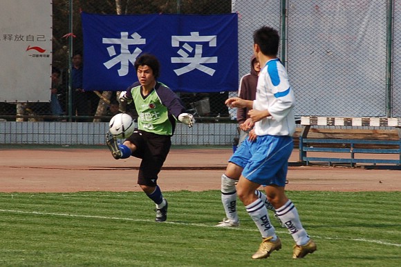 对方守门员脚软了~(此球被我方队员截获,攻入球门,可惜主裁判判进球无效)
