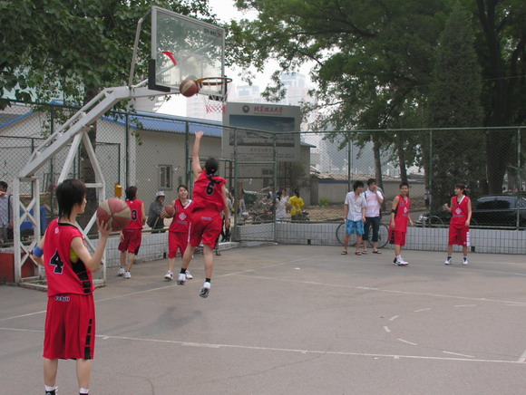 这边巾帼不让须眉,完美的传球配合、精彩的三分入球展示了女篮队员精湛的篮球技术