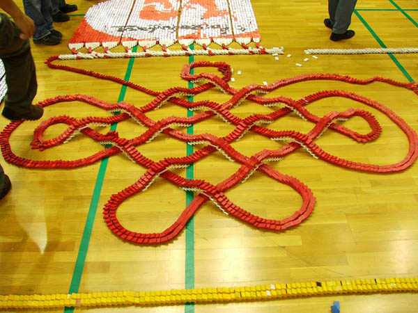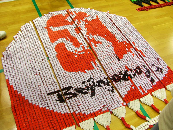 我校参赛代表队在校团委组织下,由付玉良等9名同学组成。在校学生会、校研究生会、光电创新基地、机电航模队老师、同学的大力支持下,经过近两个月的准备训练,经过20小时的精心码牌,终于完成最后的参赛作品。当5万张骨牌一气呵成全部倒下的瞬间,全场响起最热烈的掌声。