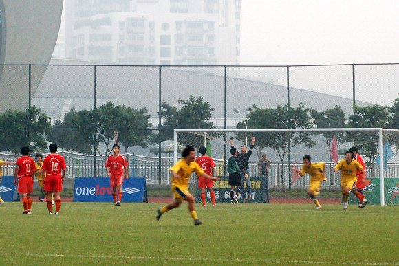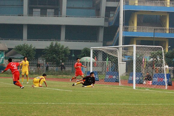 经过前场积极的拼抢,我方终于在最后一刻获得了一次左路前场任意球,8号队长袁微准确地将球吊至对方球门前,面对天津火车头高大后卫的围剿,我方身高没有任何优势的边卫24号杨扬奋力争顶,在对方守门员几乎没有任何心理准备和反应的情况下,皮球竟然划过一道优美的弧线后射入了球门的死角~~~