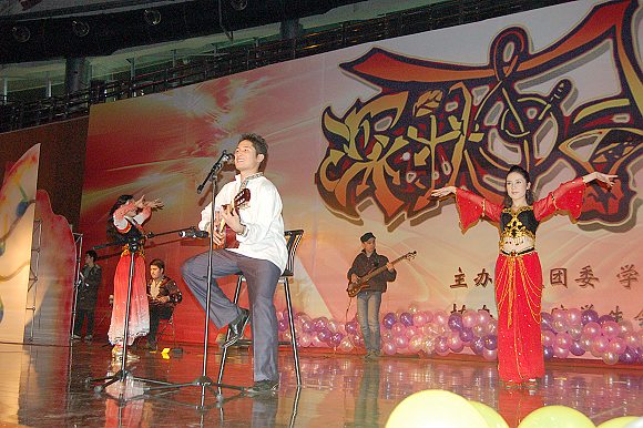 《情人》是五号选手爱克拜尔的拿手曲目,他是一名少数民族选手,在1个月的深秋歌会全程比赛中都有出色的表现,这此他还带来了几位伴奏和伴舞的同学,并最终以出色的表演获得了亚军。