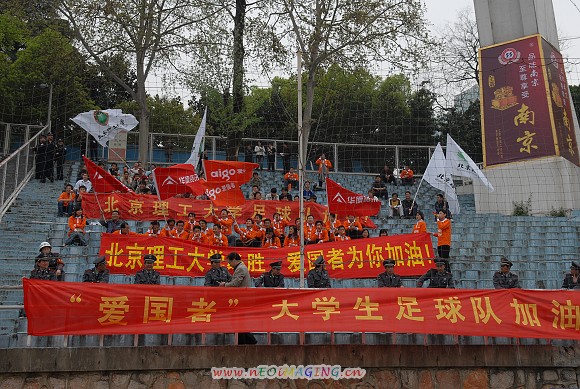 由南京理工大学的同学们和华旗集团南京分公司的球迷联手组成的“爱国者大学生”啦啦队气势丝毫不输主场球迷方阵。