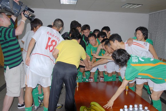 而在赛场边,还有专门的重庆大学生组织的拉拉队“倒戈”为自己的大学生球队加油,比赛结束后,虽然难掩失望,但球员还是整齐地走到金志扬面前鞠躬,然后继续在场边进行放松训练。金志扬在赛后也解释自己为什么在比赛结束后没有第一时间起身离开,“我在等他们过来给我鞠躬,这是我们的规矩”,和一般的职业队相比,他和球员的关系是教授和学生的关系,“师道尊严是我们必须讲究的,他们首先是学生然后才是球员,先做人再踢球。”不过金志扬也不讳言,“我们的路很难走,对手都很强大,我们要想留在这个舞台,每一场都必须全力以赴的拼搏。”