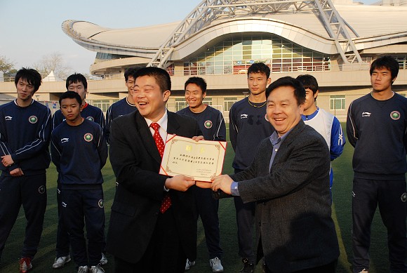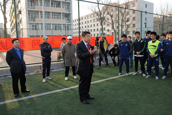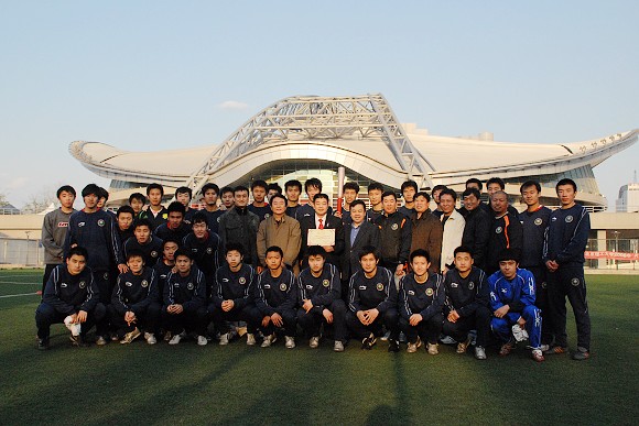 北京爱国者大学生足球队总教练兼领队金志扬、主教练曹限东、米兰milan官方网站体育部主任刘启孝以及华旗爱国者公司总裁助理苗俊等领导和相关人员出席了简短的聘任仪式。