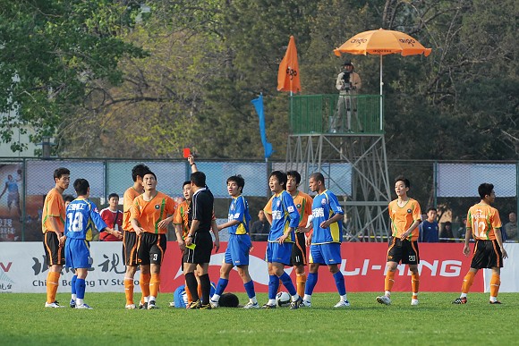 第40分钟,舜天在禁区边缘地带争抢时倒地,裁判判罚江苏舜天获得点球,32号外援巴洛斯一蹴而就将比分扩大为2-0。这次争议判罚也引起了爱国者队主帅曹限东的强烈不满。半场结束前双方的激烈拼抢曾经导致场上队员连续的人仰马翻。