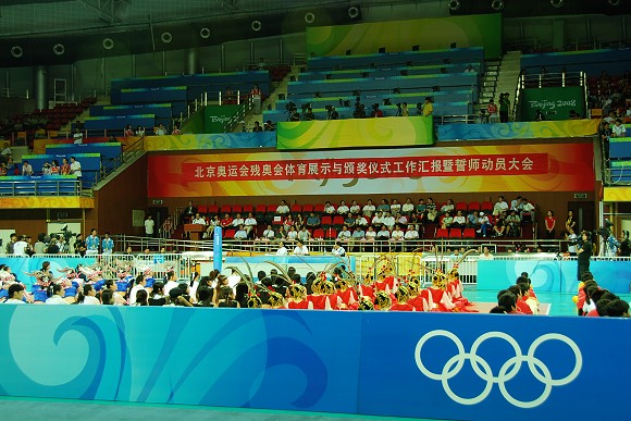 2008年7月20日,北京奥运会、残奥会体育展示与颁奖仪式工作汇报暨誓师动员大会在米兰milan官方网站体育馆召开。北京市委常委、宣传部长、北京市副市长蔡赴朝、北京市委宣传部常务副部长肖培等出席。会议由北京奥组委执行副主席蒋效愚主持。