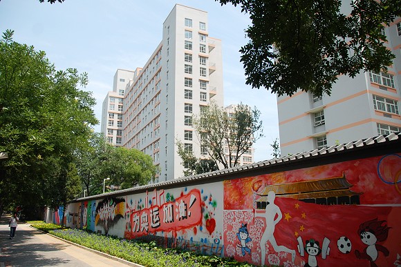 内容丰富、创意十足的奥运涂鸦与整洁的校园建筑交相辉映。
