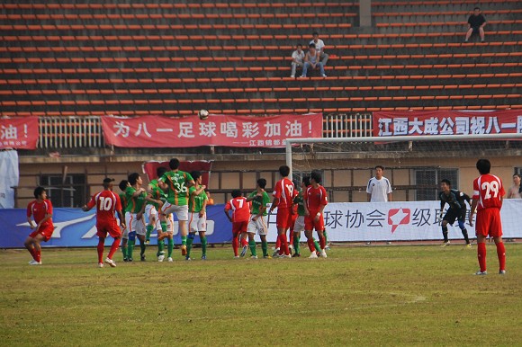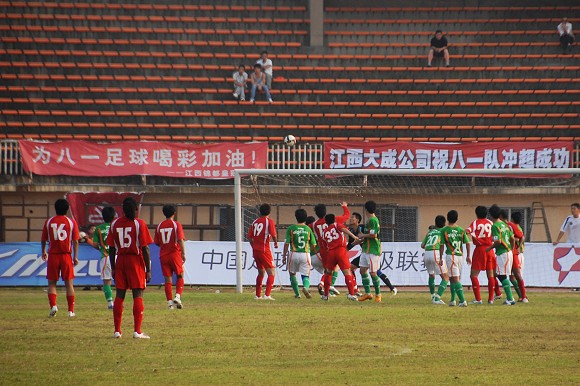 第35分钟,南昌八一队获得前场任意球,阿莱士的任意球打在门楣上弹出。