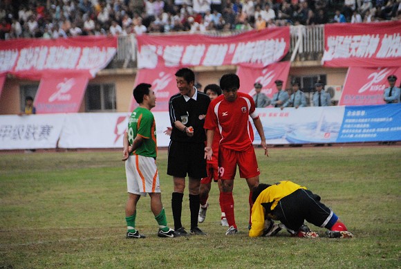 但南昌八一队此时显现了自己的“老练”,不断有队员抽筋倒地、慢吞吞地更换球员,直到补时阶段,连南昌队门将都以“无接触倒地”来拖延时间的情况下,最终南昌八一队4-3险胜北京理工队!