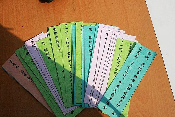 飞愿志愿者协会也精心制作了爱心小书签,并将书签赠送给每位捐衣捐物的师生。正如当天二十三度的高温一样,大家的热情持续高涨。