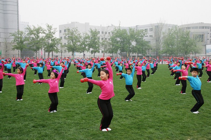 开幕式团体操表演精彩纷呈,将开幕式推向了高潮:刀剑棍鞭、砍刺盘舞,轻如行云流水、矫似神龙掠空、势若猛虎出柙,观众陶醉于武术表演中;“罗衫叶叶绣重重,金风送鹅各一丛”,475名教职工表演的广播体操成为绿茵场上的一大亮点,整齐协调、舒展流畅的表演为运动会增添了热烈、隆重的气氛;伴随着“七彩阳光”的旋律,361张天真活泼的笑脸出现在绿茵场上,跳跃灵动的哑铃操表演,舞出了孩子们天真烂漫的童心世界。