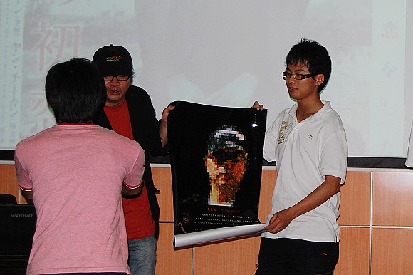 最后同学们送给章导一副原创的印有章导照片的宣传画,其中人物影像是由章导系列作品中的分镜头拼成的,章导非常高兴,也送给红河影碟作为礼物,并与同学们达成一个美好的约定,章导系列电影音乐欣赏演奏会将在理工大学进行首演。
